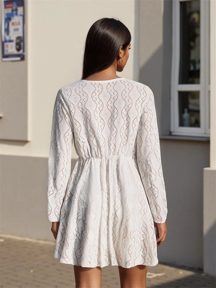 Women Autumn Knee Length Dress Long Sleeve Deep V Neck Lace Patchwork Eyelet Dress